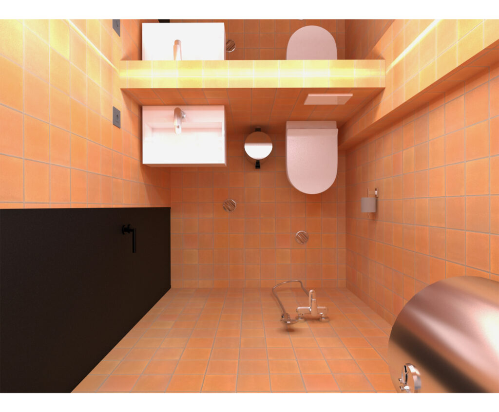 Since the former condition was super simple and did not include a toilete, an addition had to be made. The toilete had to look and feel minimal and include a shower, so that the owner could use it at ease. Since the rest of the space was been dominated by plain materials (epoxy resin floor,exposed concrete etc) and quite neautral, the toilete in order to obtain a specific character had to have a distinctive material that would stand out despite its simplicity. Cotto tile appear to be the ideal solution for their distinc texture and warm color. The result was a super friendly and cosy space that urges the user to spend more time in it. The fact that the only source of light came through the facade meant that the toilete which was in the back would have no access to it. The reatining walls stop at a height of 2.3m leaving the rest of the available space for an angular window that lets the light inside. When the lights are turned on a beautiful effect is created and emitted to the rest of the space creating the illusion of a bigger space.
